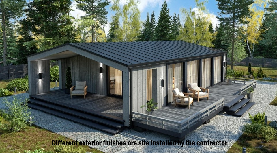 Our steel homes arrive 90% complete. The steel roof trusses, covered porch, siding or stucco exterior are site installed.